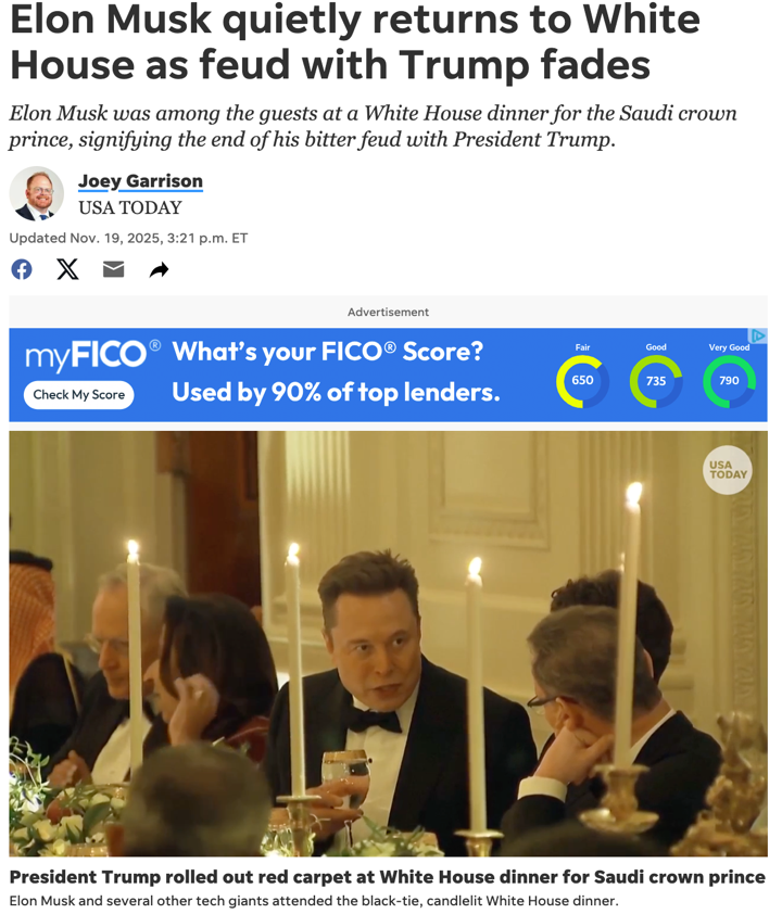 从这一角度看,11月18日的白宫晚宴,更像是一个新阶段的起点:马斯克不再是当年那个只谈环保、谈太空梦的创业英雄,而是一个手握巨量算力需求、主导多条产业链、能左右部分舆论的“AI时代大玩家”。这场晚宴并不能回答所有问题,却已清楚传递了一件事——在接下来围绕人工智能、芯片和中东算力布局的博弈中,他注定会一次次地出现在镜头正中。