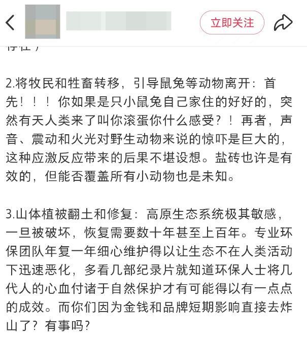 另外从现场视频可见,烟花燃放点紧邻山体植被。尽管相关方提到“燃放后翻土修复”,但部分户外爱好者担心,燃放时的高温可能灼伤表层土壤与原生植被,而高原植被一旦受损,往往需要数年甚至数十年才能恢复。“翻下去污染地下水,翻上来贫瘠底土根本长不出草。”有网友在社交平台留言。