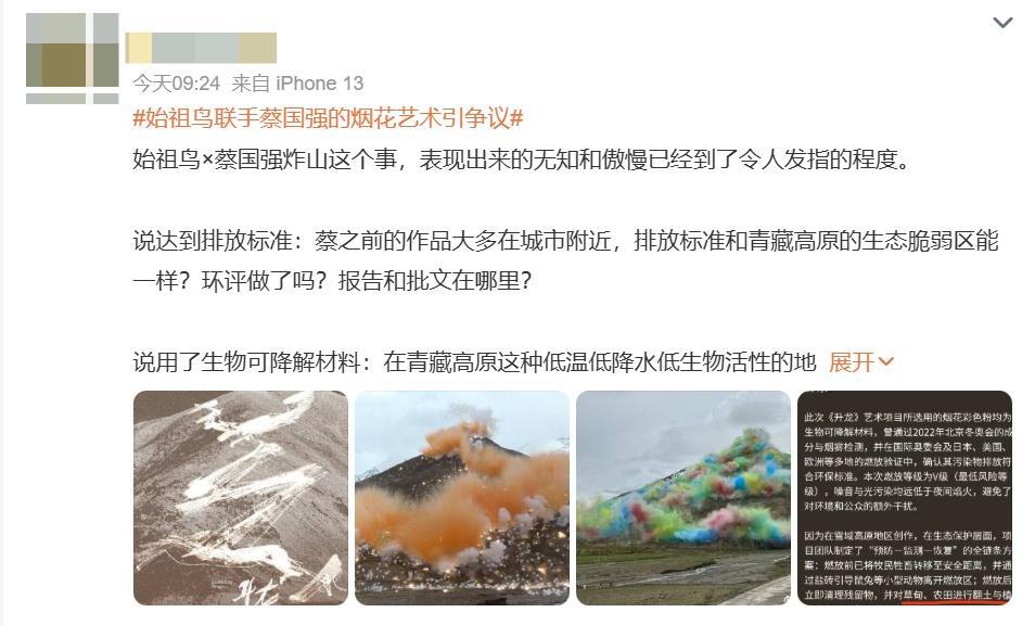 同时,活动合作方@悦游CNTraveler也在社交媒体平台回复网友称,活动经科学评估、使用环保材料。但截至发稿,始祖鸟官方小红书、蔡国强社交平台等相关视频均已下架,南都·湾财社记者就此事向始祖鸟方面发去采访函,截至发稿暂未取得回复。